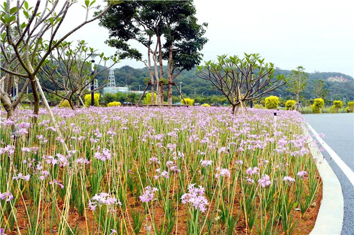 置身湿地花海,放眼望去,本地木棉、黄花槐、凤凰木、黄花风铃木、宫粉紫荆等乔木的巧妙布局,让整体景观显得生动有趣。此外还种植了再力花、美人蕉、香蒲、狐尾藻、千屈菜等水生植物来保护湿地、净化水质。