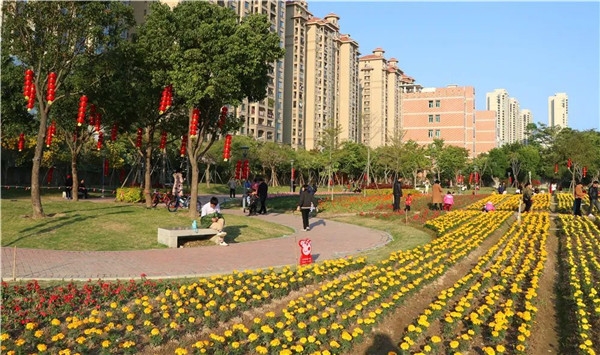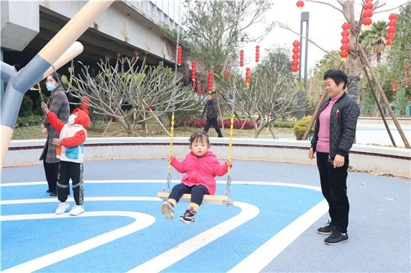 孩子们在公园内追逐嬉戏,家长们迎着暖暖阳光安坐一旁唠家常,郁郁葱葱的植被环绕在紫色的马缨丹花丛周围,为城市增添了一抹亮色。园内文化景墙、景观小品上一首首耳熟能详的闽南童谣,镌刻着一代又一代人的童年记忆。