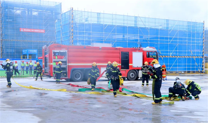 现场还组织消防应急救援实操演练,模拟施工现场用电不规范导致火灾。事故发生后,工地迅速启动消防应急预案,施工单位组建应急救援小组迅速反应,并第一时间请求消防及救护援助。随后,消防应急车辆和救援队伍也赶赴现场进行灭火和救援工作。演练过程中,各岗位人员反应迅速,协同配合,疏散过程安全有序。