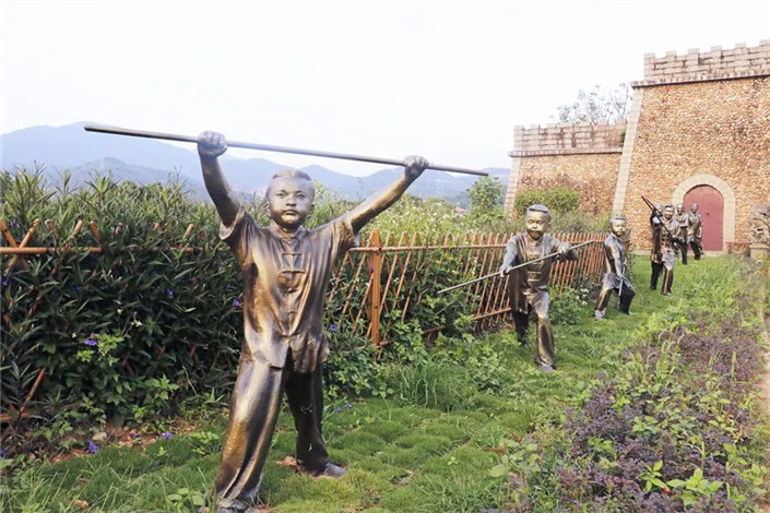 来到俞大猷大道靖国门前,便被栩栩如生的俞家棍雕塑深深吸引。各种棍法有力地展现,诠释着誓死守护家园的决心,再现俞大猷军队的威武忠勇。不同年龄段、不同性别的雕塑形象地传达了俞家棍老幼皆习的文化传统,呼应靖国门宏伟大气的形象,既弘扬俞大猷军队保家卫国的爱国主义精神,也丰富了新时代爱国主义教育的文化内涵。