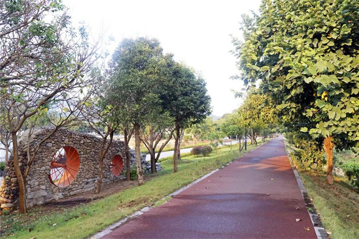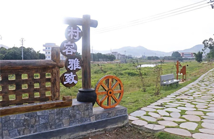 登高靖国门,放眼望去,硬化的路面整洁平整,道路两侧精心设计的景观令人赏心悦目,一条1公里长且获评“泉州市特色旅游风景道”的健身步道沿着河流蜿蜒向前,群众在步道上伴着鸟语花香散步闲聊着、运动着……坐在岸边,低头便见河市的特产槟榔芋三三两两抱团生长,经过清淤的河道也格外清澈,不远处有几头牛正低头享受着嫩草,长长的尾巴悠闲地摆动着,一切是那么宁静且祥和。