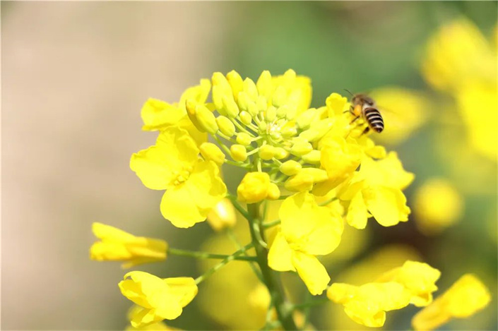 置身油菜花田野,一朵朵油菜花错落有致地分布在溪边,蜜蜂也在花间萦绕,花朵随风摇曳,花香与泥土的芬芳扑面而来,令人心旷神怡。