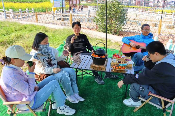 金色花海间,不少市民、游客结伴而行,远离城市的喧嚣,踏上油菜花田的小道,花田中设置浪漫路牌、田野打卡相框等多种特色打卡地,将赏花游融入围炉煮茶、露营,玩乐的同时品尝美食,打造一场春日轻松、浪漫之旅,“圈粉”更多年轻市民、亲子家庭前来游览。
