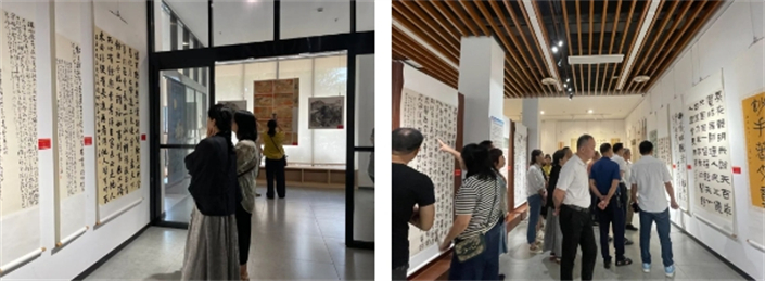 展览现场,一幅幅精美的书画作品令人目不暇接。苍劲有力的书法作品,笔锋游走之处,彰显新中国坚韧不拔的顽强意志;细腻精致的美术作品,描绘了洛江本地的秀丽风光到华夏大地的雄伟峰峦,展现新中国蓬勃的生机与活力。