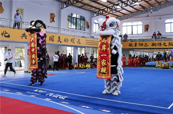 华侨大学校艺术团龙狮队带来的舞狮《双狮呈吉》拉开了表演序幕,表演者既有大陆学子也有台湾籍学生,双狮展开“共圆中国梦,两岸一家亲”对联引得现场一片喝彩。此外,台湾学子还精心学习准备了节目《长拳一段》,展示近期切磋学习成果。台湾老师也带来了精彩的《双手剑》武术表演。