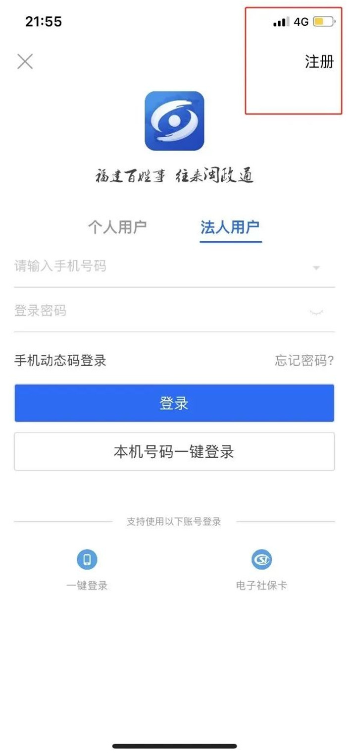 1.中小企业(含个体工商户)使用法人代表手机登录“闽政通APP”“法人用户”操作,未注册的登录“闽政通APP”,找到“我的”菜单,进行“法人用户”注册和身份认证。