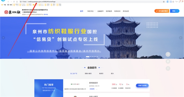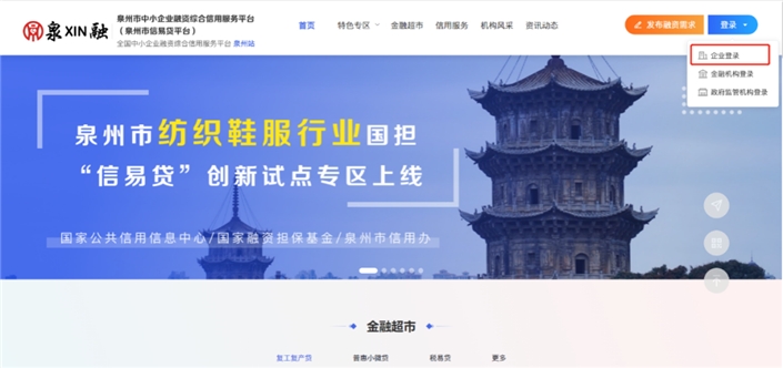 1.打开网址://credit.quanzhou.gov.cn:9080/#/homePage,或百度搜索“泉州市中小企业融资综合信用服务平台”“泉州市信易贷平台”,点击链接登录泉州市信易贷平台互联网门户网站。