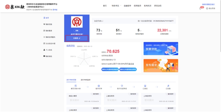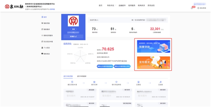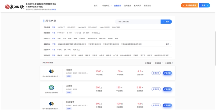 泉州市信易贷平台具备发布融资需求、金融产品浏览和申请、信用报告查询、企业自主信息申报等功能,智能匹配企业信用信息,直通银行对接受理,为企业提供7×24小时“云上申请”“码上办贷”服务。