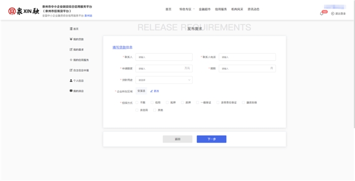 4.点击“我要贷款”可跳转查询、选择合适的金融产品进行贷款;点击“发布需求”或网页右上角“发布融资需求”,可发布自己的贷款需求。