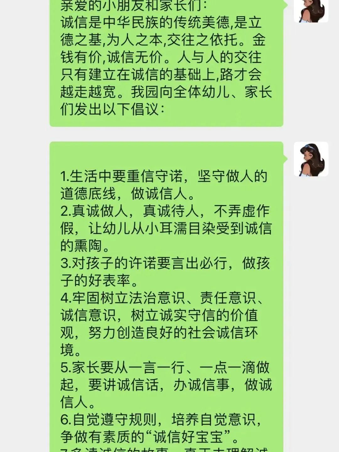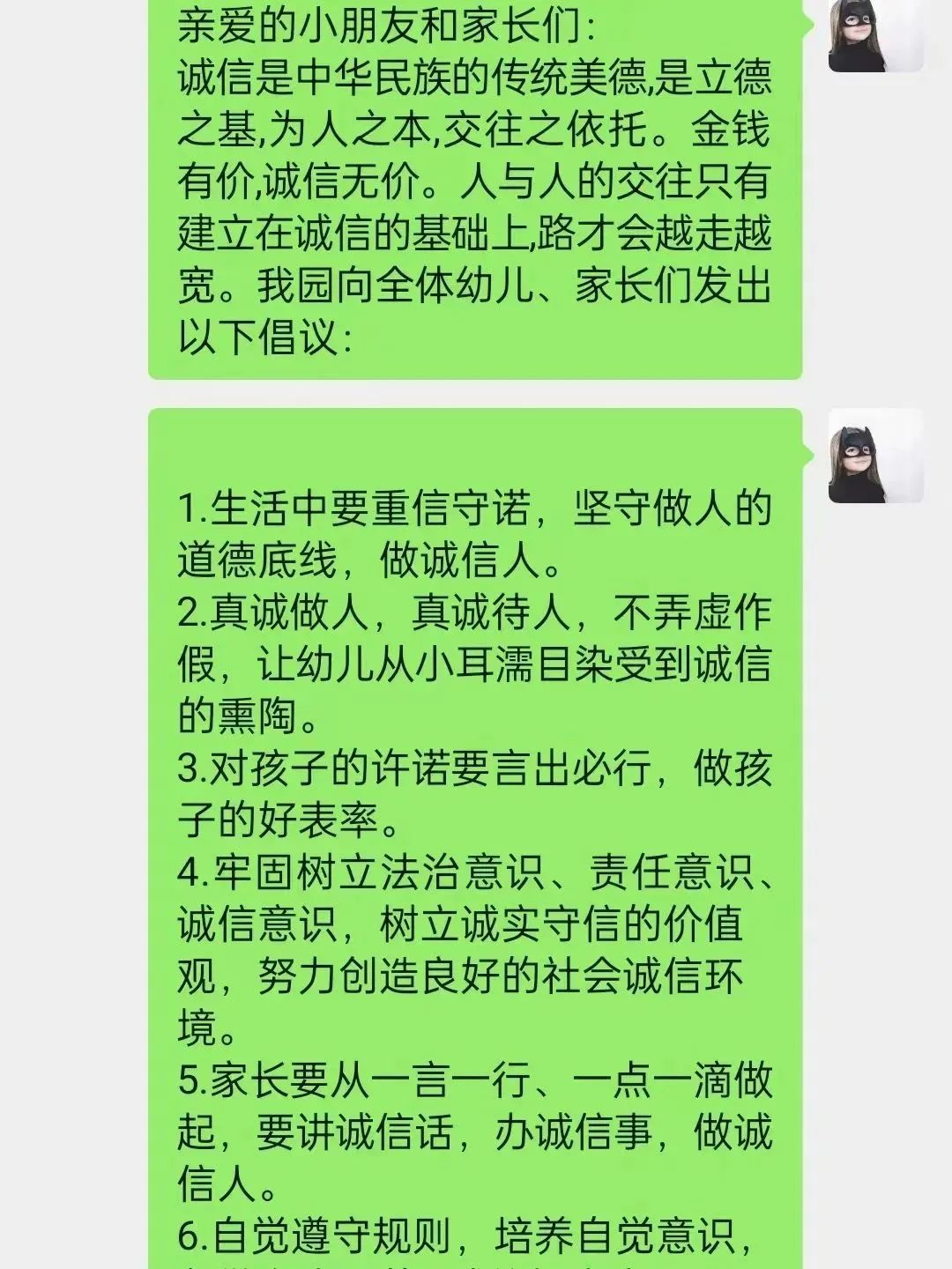 良好的家庭教育对于孩子的健康成长必不可少,父母的行为是孩子最好的榜样。因此,老师们通过班级群向爸爸妈妈们发出倡议,呼吁爸爸妈妈们在日常生活中应以身作则,言行一致,用自己的诚信行为去影响和感染孩子。