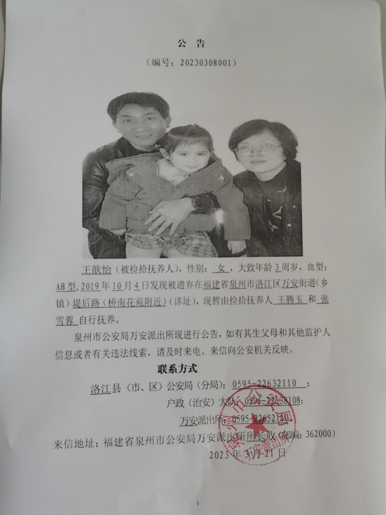 关于被捡拾抚养人员的公示