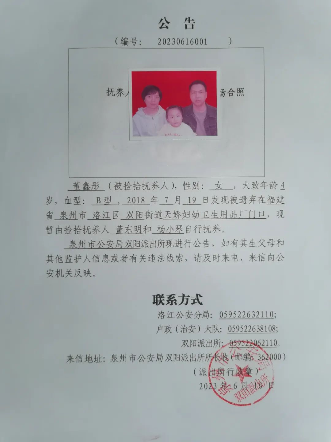 董鑫彤(被捡拾抚养人),性别:女,大致年龄4岁,血型:B型,2018年7月19日发现被遗弃在福建省betvictor伟德官网 双阳街道天娇妇幼卫生用品厂门口,现暂由捡拾抚养人董东明和杨小琴自行抚养。泉州市公安局双阳派出所现进行公告,如有其生父母和其他监护人信息或者有关违法线索,请及时来电、来信向公安机关反映。
