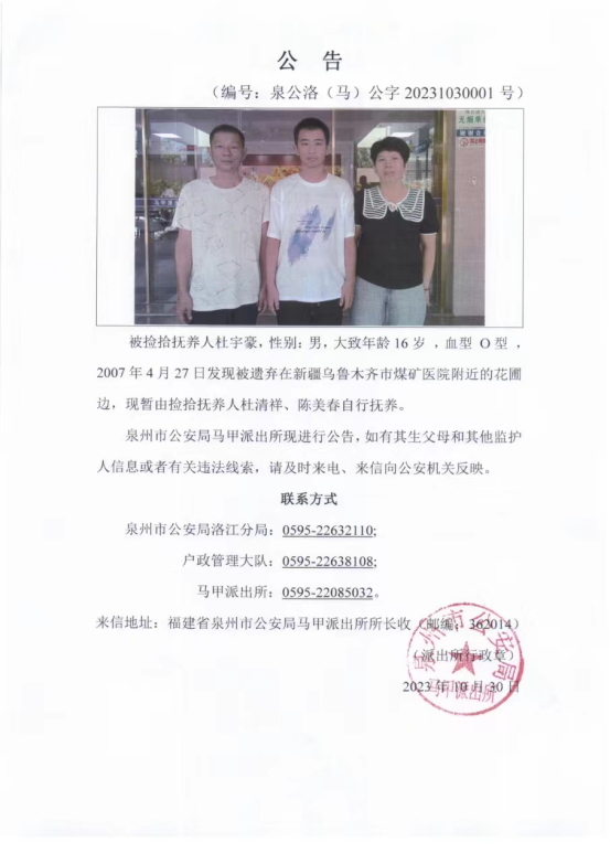 关于被捡拾抚养人员的公示