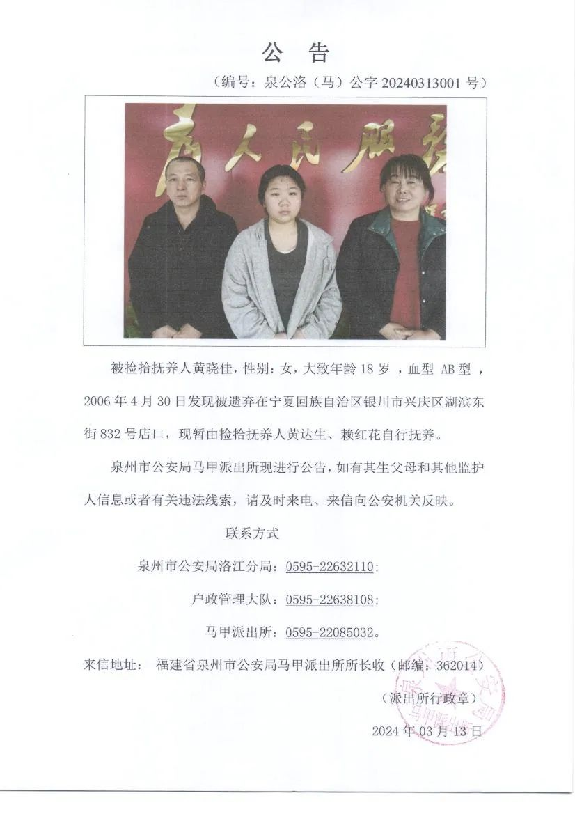 被捡拾抚养人黄晓佳,性别:女,大致年龄18岁,血型AB型,2006年4月30日发现被遗弃在宁夏回族自治区银川市兴庆区湖宾东街832号店口,现暂由捡拾抚养人黄达生、赖红花自行抚养。泉州市公安局马甲派出所现进行公告,如有其生父母和其他监护人信息或者有关违法线索,请及时来电、来信向公安机关反映。