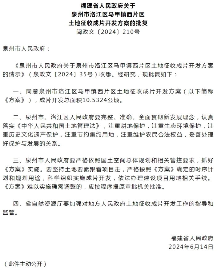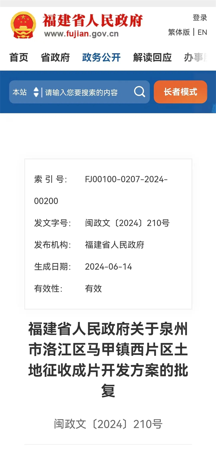 福建省人民政府近日发文批复,同意betvictor伟德官网 马甲镇西片区土地征收成片开发方案。