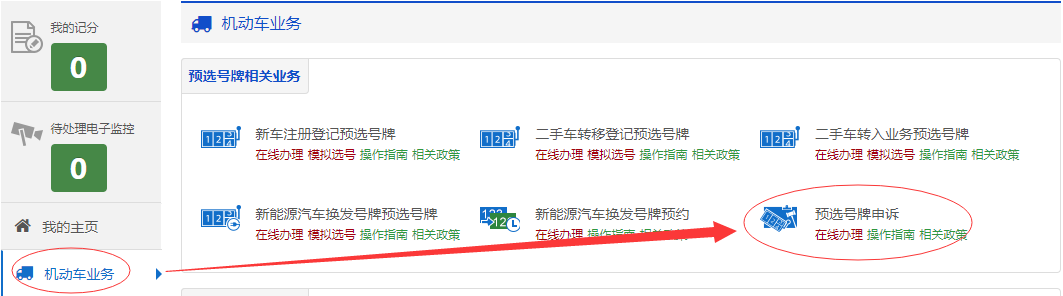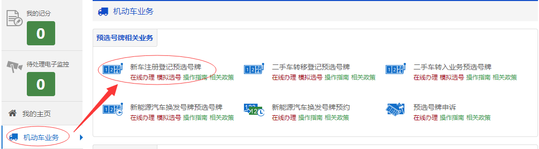 互联网注册用户在互联网登录后,点击【机动车业务】→【新车(含新能源汽车)注册登记预选号牌】下的【预选号牌】进入预选号牌流程。如下图所示。