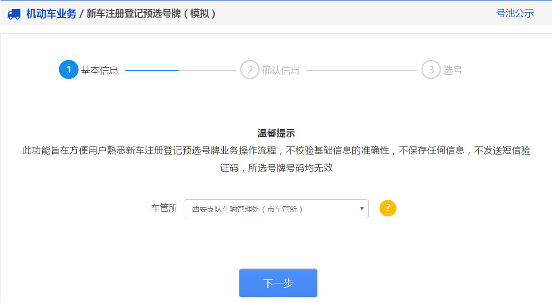 用户首次进入该功能,系统将显示预选号牌服务说明页面,点击页面中的【提交信息】按钮,进入第一阶段【基本信息】步骤。用户应当选择本人或本单位办理新车注册登记业务的车管所,如下图所示。