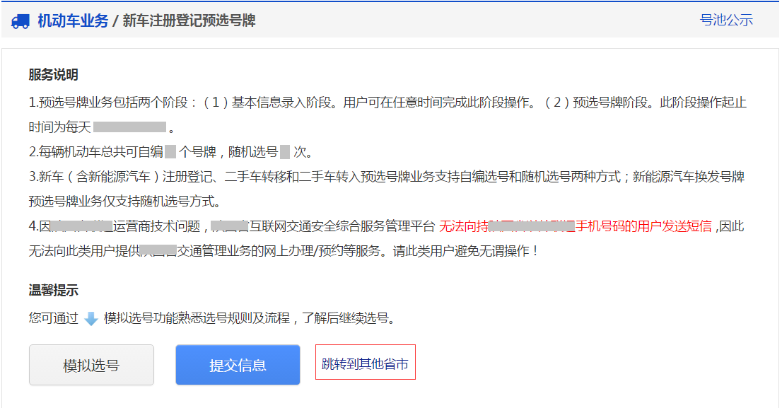 (1)请用户务必认真阅读业务须知,知晓预选号牌号码有效期、信息录入要求以及其他内容。