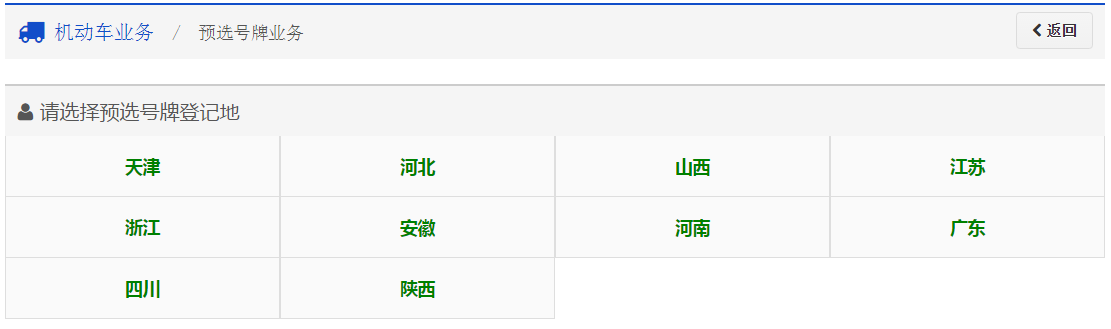 点击预选号牌服务说明页面中红色标示的“跳转到其他省市”链接,进入全国省市互联网服务平台选择界面。 用户根据本人新购小型汽车(或大、小型新能源汽车)需要上牌的车管所选择相应的省市,系统会自动跳转到用户选择的省市互联网服务平台的预选号牌betvictor伟德官网。如下图所示:
